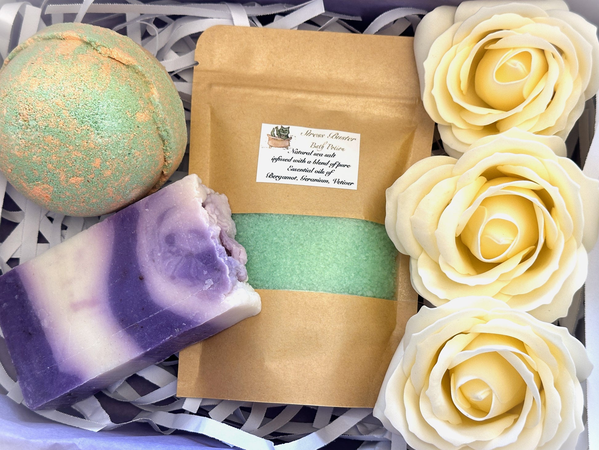 Take some time to relax and rejuvenate with our Stress Buster Gift. This Aromatherapy bath spa gift is crafted with a blend of pure essential oils and sea salt, designed to relax your body, energize your mind, and clear your thoughts. Immerse yourself in the calming and sensual atmosphere of soap rose petals releasing their natural fragrance. Bergamot will leave you with a fresh and zingy impression, Geranium, with its undeniable freshness, will make you feel bright and refreshed, and Vetiver will relieve the stress. Treat yourself or a loved one to this thoughtful and caring gift.