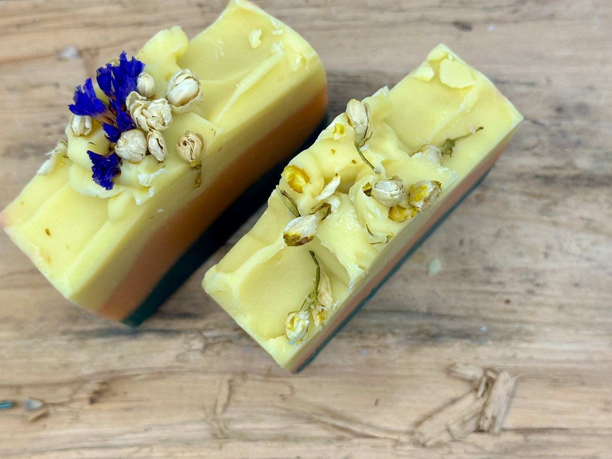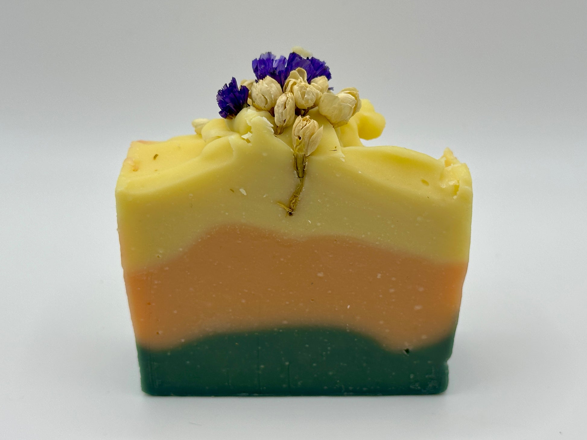 Ingredients: Aqua, Citric Acid, Mango Butter, Shea Butter, Coconut Oil, Olive oil, Castor Oil, Sweet Almond oil, Cocoa butter, Fresh Mango Pure, Sodium Hydroxide, Dried Statice Sinuata Blue Flowers, Dried Jasmine Flowers, Maca powder, Essential oils: Pink Grapefruit, Lemon, Lavender, Peppermint, Petitgrain.